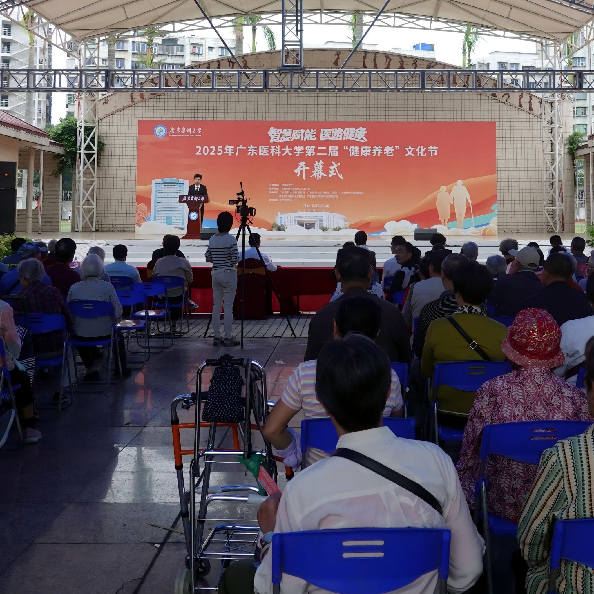 秋送爽,丹桂飘香,重阳佳节之际,2025 年 10 月 29 日下午,广东医科大学第二届“健康养老”文化节在湛江校区千禧园拉开了帷幕。中共湛江市委老干部局副局长柯志广、湛江市医学会副会长张宗平、学校党委副书记黄达海,学校老领导黄志生、侯小慧、颜大胜,以及相关职能部门、学院、附属医院负责人和离退休人员等出席了开幕式。