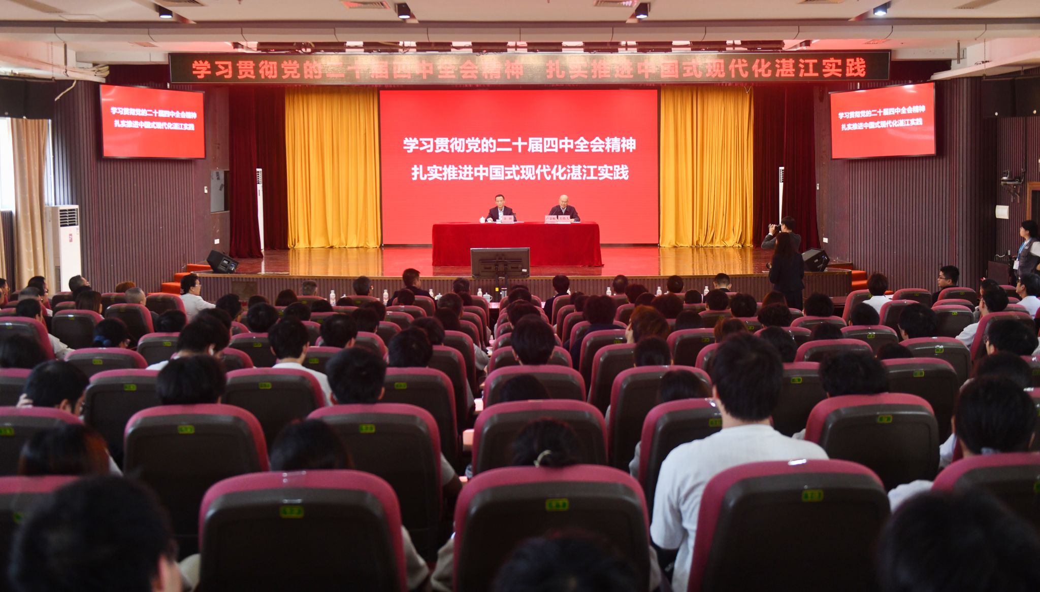 12月11日,在深入学习贯彻党的二十届四中全会精神、学习贯彻习近平总书记视察广东和出席第十五届全国运动会开幕式重要讲话重要指示精神、谋划“十五五”事业发展之际,湛江市委书记余钢莅临学校为全校师生讲授题为《学习贯彻党的二十届四中全会精神,扎实推进中国式现代化湛江实践》专题思政课。学校党委书记、校长卢景辉主持思政课。