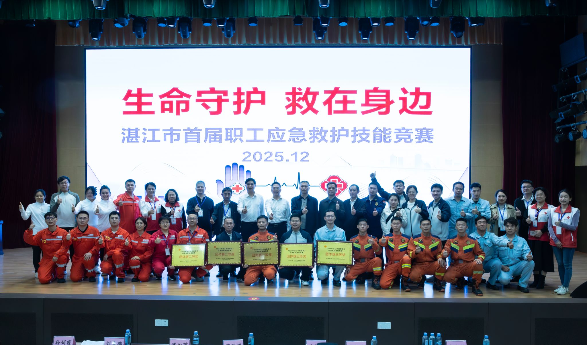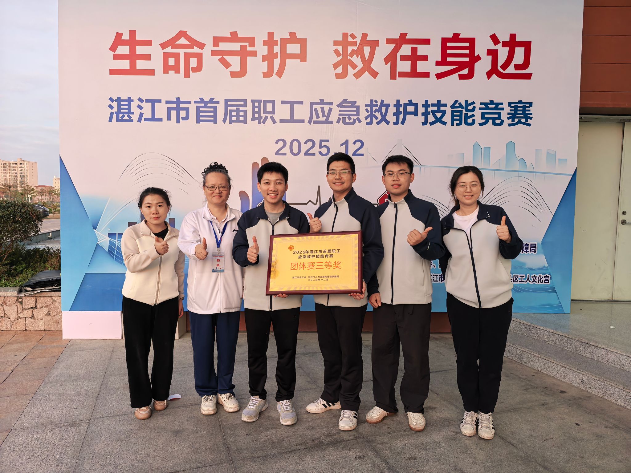 12月19日,2025年湛江市首届职工应急救护技能竞赛在坡头区文化中心圆满落幕。本次赛事由湛江市总工会、湛江市人力资源和社会保障局主办。我校代表队获团体赛三等奖,参赛队伍由第一临床医学院李卓儒、黄宇媚、张乔一、柯梁建、郭巧灵五位辅导员组成,工会专职副主席李黎担任领队,附属第二医院急诊科黄薪郡担任指导教师。